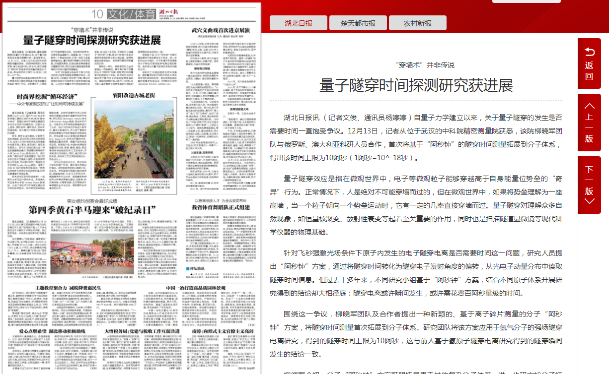 【湖北日?qǐng)?bào)】量子隧穿時(shí)間探測(cè)研究獲進(jìn)展