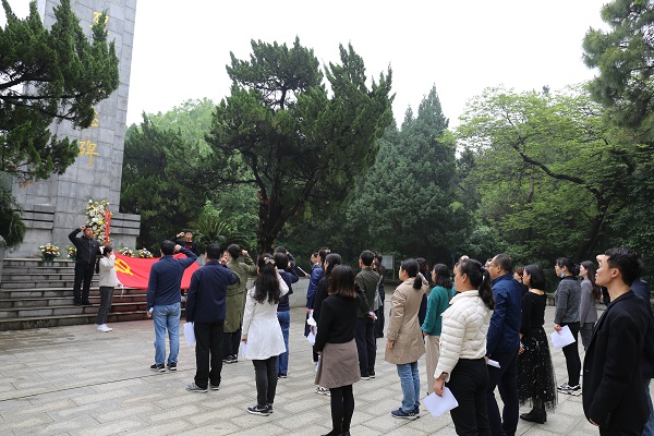 在莊嚴(yán)肅穆、蒼松挺拔的施洋烈士陵園,黨員同志們向施洋烈士紀(jì)念碑敬獻(xiàn)了花籃,鞠躬致敬,肅立默哀,大家認(rèn)真聆聽(tīng)總支書(shū)記朱航介紹施洋烈士的革命生平。四名同志展開(kāi)黨旗,在朱航的領(lǐng)讀下,全體黨員重溫入黨誓詞,并集體誦讀施洋烈士《給妻子的信》。最后大家圍繞烈士墓碑一周,在墓碑篆刻的銘文中尋找歷史的滄桑與足跡。