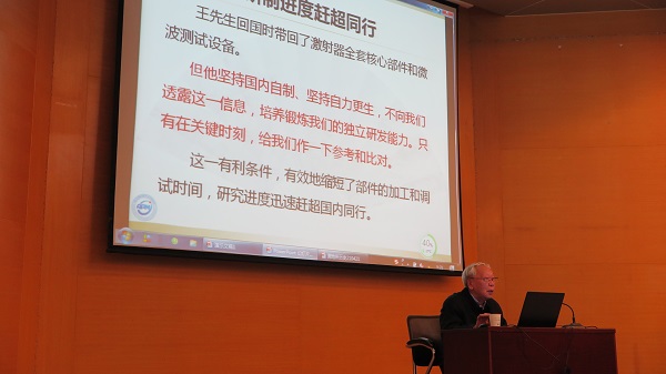 無論是奮斗初期王天眷先生帶領(lǐng)年輕人從一無所有中艱難起步時(shí)的篳路藍(lán)縷,還是特殊時(shí)期研究受阻但仍心系國家一心為公的赤膽忠心,無不展現(xiàn)著早期科研人員雖然條件艱難但信念堅(jiān)定的精神風(fēng)貌。在談到核潛艇相關(guān)系統(tǒng)試驗(yàn)過程中,項(xiàng)目組成員連續(xù)加班,春節(jié)未休,就連臨產(chǎn)準(zhǔn)媽媽、哺乳媽媽和帶著2-3歲幼兒的母親都加班到深夜時(shí),裘鑒卿熱淚盈眶,久久不能平靜,現(xiàn)場(chǎng)響起了掌聲,大家無不為這種舍己奉公的科學(xué)信仰所動(dòng)容。高布錫通過一張張彌足珍貴的歷史照片把大家?guī)Щ亓四切┮試倚枨鬄樾袆?dòng)指南、努力追求更高技術(shù)前沿的科研工作者中間,讓大家近距離感受到這群堅(jiān)信勤能補(bǔ)拙的年輕人為了國家富強(qiáng)和民族振興而無畏前行的時(shí)代氣息。故事結(jié)尾處,高布錫為當(dāng)前年輕人擁有能夠施展身手的大好平臺(tái)而感到欣慰,給現(xiàn)場(chǎng)的年輕人建議了諸多有意義的課題,他堅(jiān)信現(xiàn)代測(cè)量技術(shù)前途無量,開創(chuàng)新的理論及發(fā)展儀器研制工作一定大有作為,并勉勵(lì)大家為之奮斗,老當(dāng)益壯的科研風(fēng)貌讓在場(chǎng)的每個(gè)人都受益匪淺。