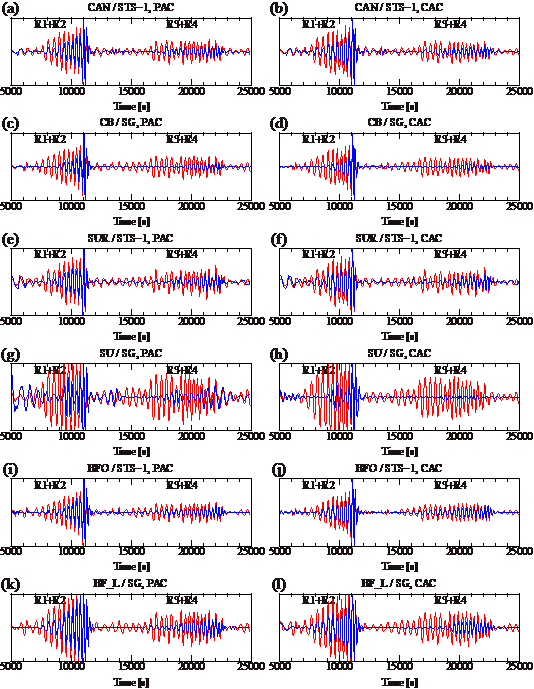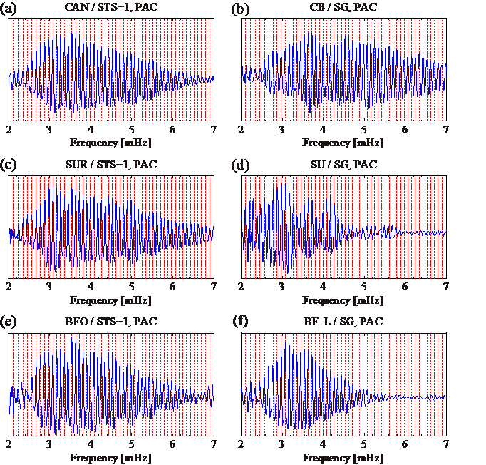 圖1 不同臺(tái)站超導(dǎo)重力儀與地震儀同址觀測(cè)到的地球長周期面波信號(hào)(SG表示超導(dǎo)重力儀,STS-1表示地震儀;紅線表示未扣除地震影響的結(jié)果,藍(lán)線表示扣除地震影響后的結(jié)果;PAC表示相位自相關(guān)方法,CAC表示傳統(tǒng)自相關(guān)方法;CAN和CB、SUR和SU、BFO和BF_L表示各同址觀測(cè)臺(tái)站)
