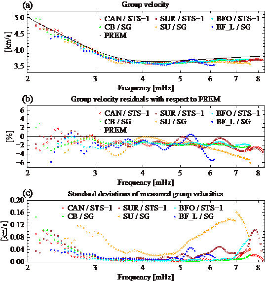 基于以上考慮,地震與地球內(nèi)部物理學(xué)研究團(tuán)隊(duì)利用全球分布的超導(dǎo)重力儀和同址觀測(cè)的STS-1地震儀長時(shí)間積累的觀測(cè)資料,實(shí)施了精細(xì)的數(shù)據(jù)預(yù)處理與分析,并采用自相關(guān)方法提取了長周期面波(2-7.5mHz,即133.3-500s)和地球自由振蕩,并對(duì)提取到的面波信號(hào)進(jìn)行了群速度頻散曲線的測(cè)量,通過對(duì)兩種不同觀測(cè)技術(shù)得到的結(jié)果進(jìn)行對(duì)比,驗(yàn)證了超導(dǎo)重力儀提取結(jié)果的可靠性。