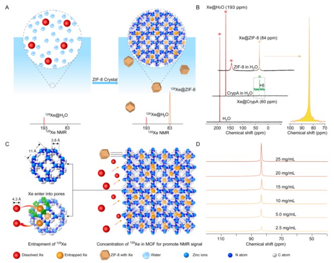 該研究中,首次提出水穩(wěn)定性的金屬有機(jī)骨架材料(MOF)——ZIF-8作為129Xe的納米“籠”來裝載129Xe,能有效提高水溶液中“籠”內(nèi)129Xe的濃度,利用課題組自主研制的超極化氣體磁共振科學(xué)儀器,顯著增強(qiáng)了水溶液中“籠”內(nèi)129Xe的磁共振信號,比傳統(tǒng)分子“籠”內(nèi)129Xe的磁共振信號提高了200倍,實現(xiàn)了超極化129Xe磁共振分子影像領(lǐng)域的重要突破。進(jìn)一步,由于突破了 “籠”內(nèi)Xe信號強(qiáng)度的壁壘,可在生物檢測中利用該信號與血液中信號之間的化學(xué)交換,放大血液中的微弱信號,從而提升血液中分子探測的靈敏度。