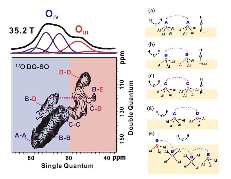 固體NMR譜學的重要特點之一是能夠利用射頻脈沖技術操控特定原子核(nuclei-specific)從原子-分子尺度來探測核間的空間相關(through-space)或鍵連 (through-bond) 結構信息。在該研究工作中,課題組與美國國家強磁場實驗室合作,借助于該實驗室的穩(wěn)態(tài)超高強磁場35.2 T(1.5 GHz)在提升NMR觀測靈敏度和分辨率上的巨大優(yōu)勢,結合課題組前期自主開發(fā)的半整數四極核二維雙量子(DQ-SQ)脈沖實驗方法(J. Magn. Reson. 2009, 200, 251;Angew. Chem. Int. Edit. 2010, 49, 8657;J. Am. Chem. Soc. 2013, 135, 1607),在γ-Al2O3上獲得了第一張二維17O-17O同核雙量子固體NMR相關譜,揭示了不同配位狀態(tài)的氧物種之間空間關聯。同時,研究人員還利用精密測量院的800 MHz(18.8 T)譜儀平臺,通過高速魔角旋轉(MAS,40 kHz)下的氫檢測二維1H-17O異核多量子相關脈沖NMR 實驗,成功區(qū)分γ-Al2O3表面吸附水、羥基以及非羥基(裸氧)物種并獲得它們之間空間臨近的信息,實現了對γ-Al2O3上氧物種結構從體相到表面的高效NMR表征。對氧中心的深入研究將為調控γ-Al2O3的性質和合理設計改進型氧化物催化劑提供了重要依據,該工作也展示了先進NMR譜儀技術和高效NMR脈沖方法相結合在原子-分子尺度挖掘材料微觀結構信息的巨大潛力。