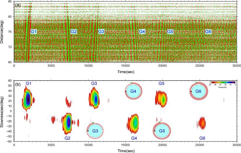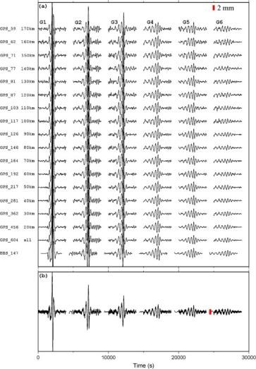 精密測(cè)量院大地測(cè)量與地球動(dòng)力學(xué)國(guó)家重點(diǎn)實(shí)驗(yàn)室地震波傳播與地球內(nèi)部結(jié)構(gòu)課題組副研究員郭愛(ài)智、研究員倪四道及合作者提出了高頻GNSS臺(tái)陣數(shù)據(jù)中地震波提取的新方法,分析研究了美國(guó)西部地區(qū)的高頻GNSS密集臺(tái)網(wǎng)記錄的2011年?yáng)|日本大地震數(shù)據(jù),發(fā)現(xiàn)高頻GNSS捕獲了清晰的R1-R5瑞利面波和G1-G6勒夫面波信號(hào),以及若干多次反射S波信號(hào)。其中,首次在高頻GNSS數(shù)據(jù)中提取到的G6勒夫波信號(hào)振幅僅為1mm,傳播距離超過(guò)了11萬(wàn)公里,繞地球近三周(圖2),表明了該方法的高靈敏度和可靠性。在此基礎(chǔ)上,團(tuán)隊(duì)率先提取了周期長(zhǎng)達(dá)600s的可靠面波頻散曲線(xiàn),為地幔過(guò)渡帶研究提供了重要數(shù)據(jù)。隨著中國(guó)北斗系統(tǒng)BDS和歐洲Galileo等更多導(dǎo)航系統(tǒng)的全球組網(wǎng)與完善,利用多系統(tǒng)高頻GNSS捕獲跨斷層蠕動(dòng)和慢地震等弱振幅、超長(zhǎng)周期信號(hào)成為可能。此研究涉及GNSS及數(shù)據(jù)處理技術(shù)、地震學(xué)、地球物理學(xué)等方向,體現(xiàn)了實(shí)驗(yàn)室跨學(xué)科特色,促進(jìn)了大地測(cè)量學(xué)與地球動(dòng)力學(xué)的交叉研究。
