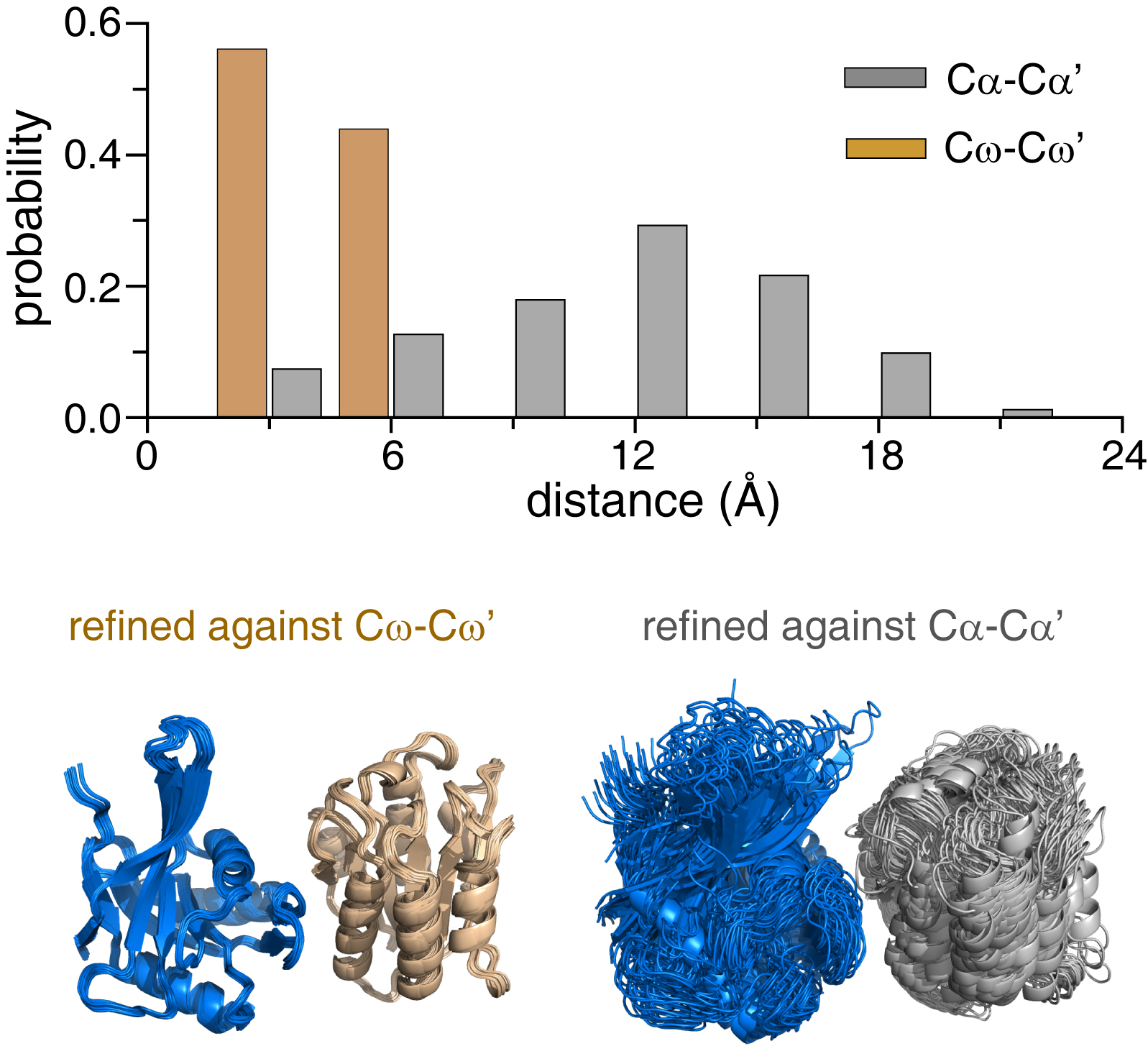 ,因此對(duì)結(jié)構(gòu)精度的提升有限。針對(duì)這一問(wèn)題,研究團(tuán)隊(duì)通過(guò)對(duì)已有的CXMS實(shí)驗(yàn)數(shù)據(jù)進(jìn)行比對(duì)分析,同時(shí)借鑒生物磁共振的思路,發(fā)展了將交聯(lián)劑修飾的側(cè)鏈Cω原子作為距離約束點(diǎn)的新方法。這種方法將約束范圍縮小到了6