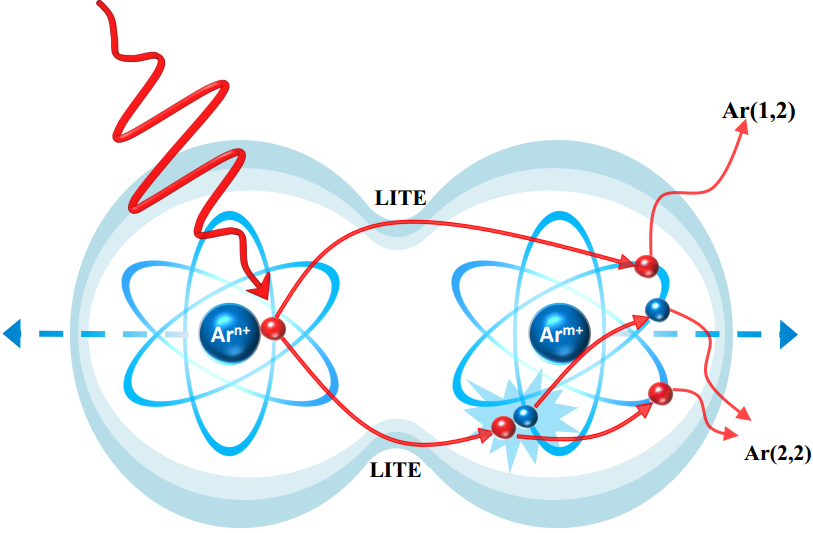 最近,柳曉軍研究團(tuán)隊(duì)與奧地利維也納工業(yè)大學(xué)Kitzler-Zeiler小組合作,采用載波包絡(luò)相位(CEP)穩(wěn)定的少周期飛秒激光對(duì)Ar二聚體分子的多光子電離-解離過程進(jìn)行了研究,發(fā)現(xiàn)二聚體分子在解離前經(jīng)歷了一個(gè)激光驅(qū)動(dòng)電子在不同原子單元間的超快遷移過程。實(shí)驗(yàn)測量發(fā)現(xiàn),Ar(2,2)解離通道的碎片離子動(dòng)量之和的不對(duì)稱性參數(shù)隨少周期激光載波包絡(luò)相位(CEP)的變化曲線相對(duì)于Ar(1,2)解離通道出現(xiàn)明顯偏移。團(tuán)隊(duì)成員王艷蘭博士結(jié)合經(jīng)典軌道蒙特卡洛方法,通過細(xì)致分析激光誘導(dǎo)電子的軌道演化,發(fā)現(xiàn)引起二聚體分子電離-解離的準(zhǔn)自由電子均經(jīng)歷了一個(gè)在不同原子單元間的快速(亞光學(xué)周期時(shí)間尺度)遷移過程。具體而言,強(qiáng)激光誘導(dǎo)二聚體分子中的某個(gè)原子釋放電子,該電子會(huì)在激光電場與原子庫侖場的聯(lián)合作用下被相鄰的另一個(gè)原子所俘獲,與其束縛電子發(fā)生碰撞能量交換,隨后發(fā)生電離并引起分子解離。Ar(2,2)與Ar(1,2)解離通道對(duì)驅(qū)動(dòng)激光載波包絡(luò)相位的不同依賴行為可歸因于由激光誘導(dǎo)電子轉(zhuǎn)移(LITE)導(dǎo)致的電子延遲電離效應(yīng)。結(jié)合理論分析,研究團(tuán)隊(duì)還預(yù)言激光誘導(dǎo)電子轉(zhuǎn)移將誘發(fā)二聚體分子內(nèi)部不同形式的電子激發(fā)或電離,結(jié)合光場調(diào)控可望進(jìn)一步對(duì)這些激發(fā)或電離過程進(jìn)行精確控制。