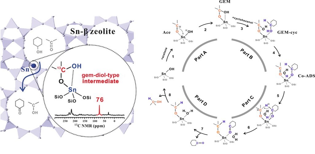 Sn-Beta分子篩上偕二醇中間體的NMR觀測(左)和基于偕二醇中間體的MPVO催化反應(yīng)循環(huán)過程(右)
