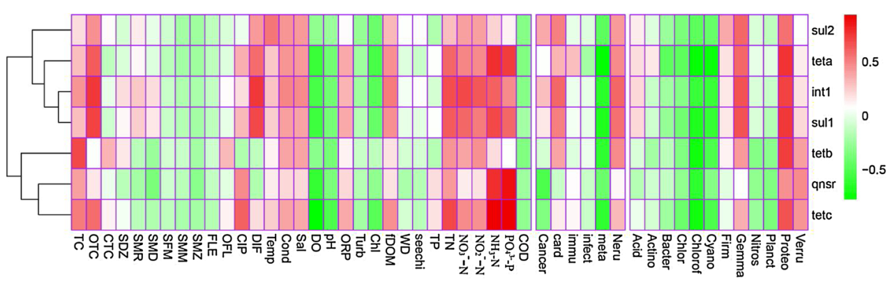 洪湖及周邊水域抗生素抗性基因與微生物群落、環(huán)境因子的相關(guān)性熱圖
