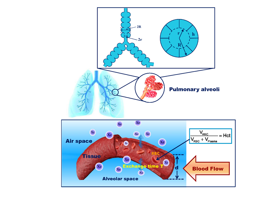 圖1.基于超極化129Xe氣體磁共振成像技術實現(xiàn)肺部微結構和氣血交換功能的定量可視化檢測示意圖
