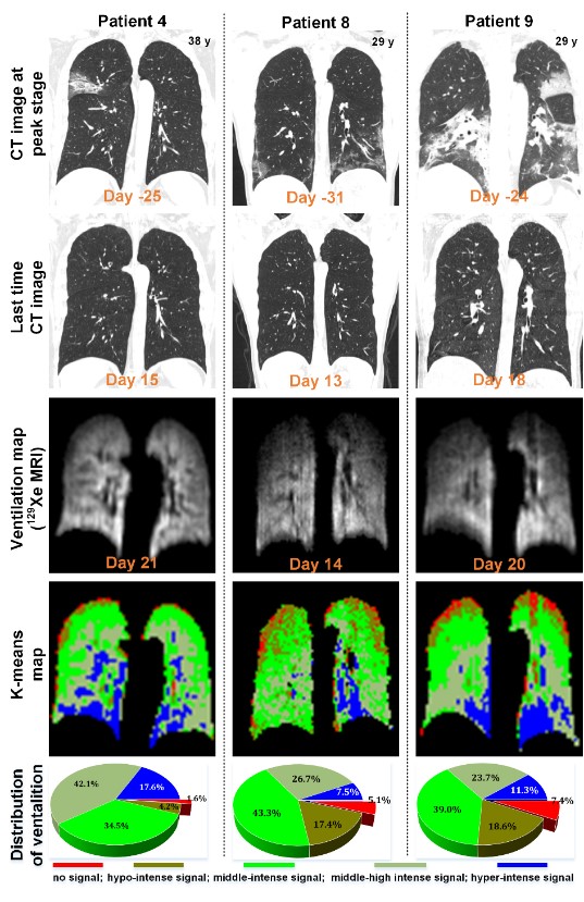 從上到下依次為:肺炎急性期時肺部CT圖像、恢復期最后的肺部CT圖像(出院前后)、對應的肺部氣體MRI影像和通氣功能的聚類圖像