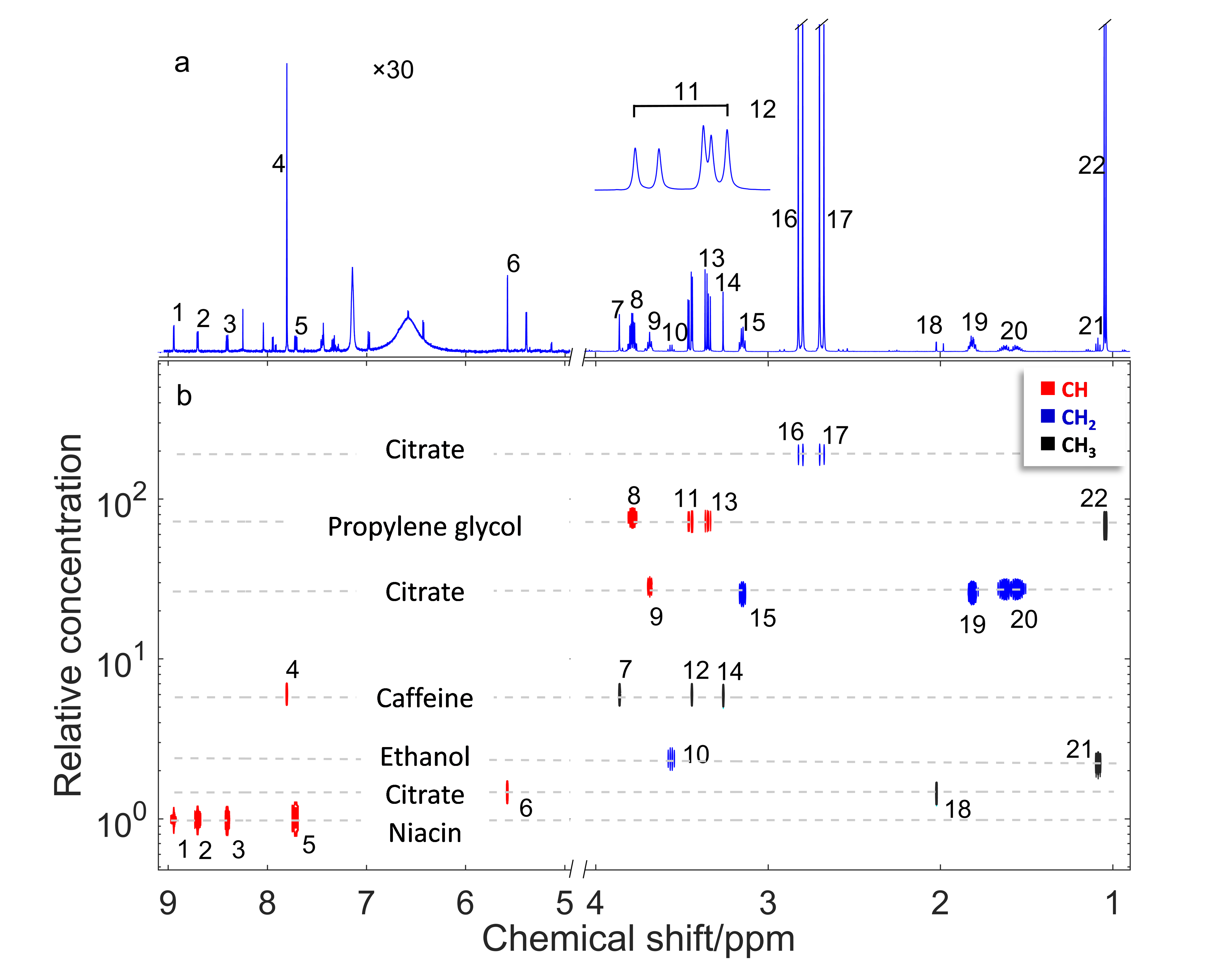 CORDY提供了一種新的、集復(fù)雜體系譜峰分離和定量分析于一體的二維NMR譜構(gòu)建方法。所依據(jù)的原理是NMR譜峰面積與濃度和相應(yīng)的原子核自旋數(shù)目(如1H-NMR中的質(zhì)子數(shù))成正比,共振吸收系數(shù)對(duì)不同分子和不同官能團(tuán)具有等價(jià)性。該工作通過(guò)數(shù)據(jù)計(jì)算,把這一基本原理通過(guò)二維譜的方式呈現(xiàn)出來(lái)。應(yīng)用CORDY方法從一張一維 NMR譜就能同時(shí)實(shí)現(xiàn)不同分子NMR譜峰的識(shí)別、分離和含量測(cè)定。把CORDY與其它NMR方法(如DOSY)聯(lián)用,拓展為三維方法(如CORDY-DOSY),能進(jìn)一步提升分離分析效率。