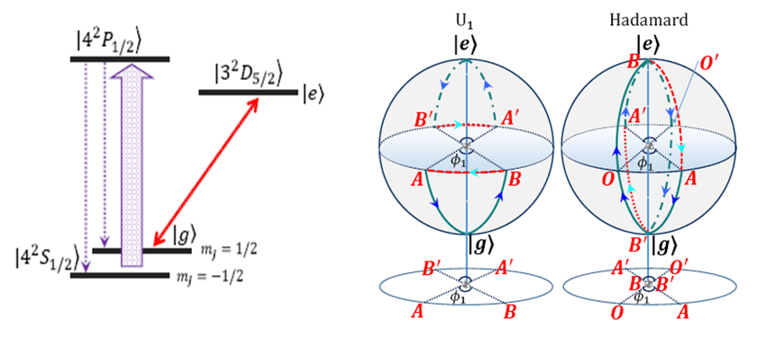 基于40Ca+離子的NNGQC實驗原理圖。左圖為量子比特的邏輯操控示意圖;右圖是U1邏輯門和 Hadamard邏輯門的幾何邏輯操作所對應(yīng)的量子參數(shù)態(tài)演化示意圖