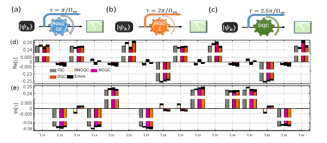 NNGQC、NGQC和DQC分別執(zhí)行U1邏輯門的實驗結(jié)果比較。上圖列出了三個門操作的時間對比為1: 2: 2.5; 下圖比較了三個門操作下的量子態(tài)演化和誤差情況,其中IQC為當作參考的理想門操作