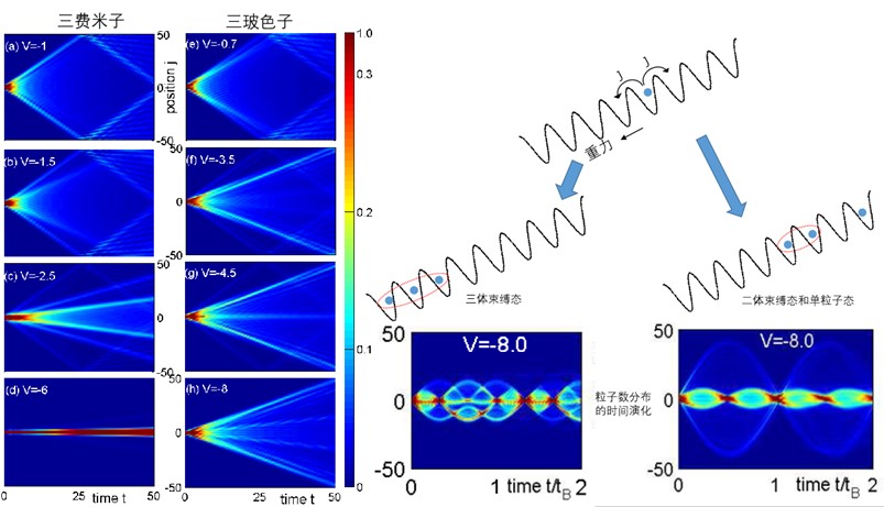 左圖:粒子數(shù)分布函數(shù)的時間演化,展現(xiàn)統(tǒng)計依賴的量子行走。右圖:在重力梯度作用下的量子行走,在周期性格點中的三粒子共同行走,或兩粒子共同行走伴隨單粒子行走,它們在重力下由于物質(zhì)波的干涉效應(yīng)只能在很小的范圍震蕩—稱為布洛赫振蕩,右下圖分別展現(xiàn)3倍頻、2倍頻及單倍頻的布洛赫振蕩