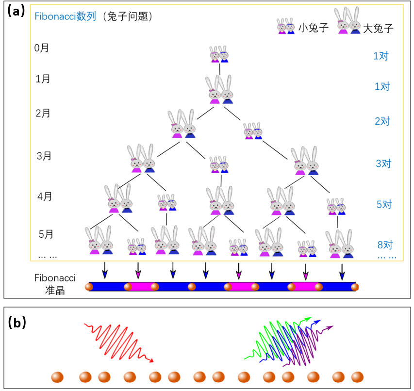 (a)Fibonacci數(shù)列(兔子問題)與Fibonacci準晶之間的關系示意圖。(b)Fibonacci準晶高次諧波示意圖