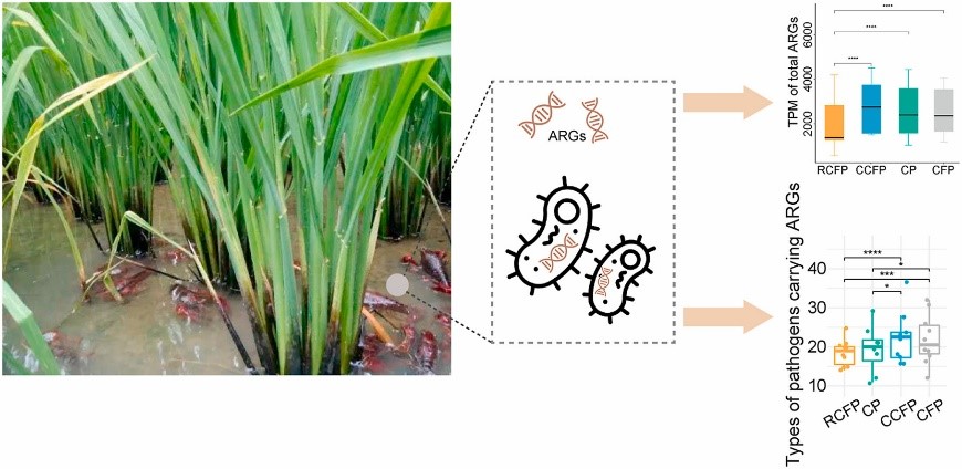 在此基礎(chǔ)上,針對“當(dāng)前有關(guān)淡水養(yǎng)殖濕地中ARGs研究大多集中在單一養(yǎng)殖模式,缺乏不同水產(chǎn)養(yǎng)殖環(huán)境中抗性基因組的比較研究”這一現(xiàn)狀,科研團(tuán)隊(duì)聯(lián)合華中科技大學(xué)寧康教授團(tuán)隊(duì)進(jìn)一步以我國淡水養(yǎng)殖主產(chǎn)區(qū)(江漢平原)的蝦塘、蟹塘、蝦蟹混養(yǎng)以及稻蝦共作四種養(yǎng)殖濕地為研究對象,通過宏基因組測序與生物信息分析,探討不同養(yǎng)殖濕地中抗生素與ARGs污染特征,并深入揭示了ARGs在不同養(yǎng)殖模式之間以及不同養(yǎng)殖動物腸道內(nèi)的形成和傳播機(jī)制。結(jié)果表明,水產(chǎn)養(yǎng)殖模式影響了養(yǎng)殖濕地水體,沉積物以及蝦蟹腸道中ARGs的組成和豐度。與蝦塘、蟹塘、蝦蟹混養(yǎng)模式相比,稻蝦共作養(yǎng)殖模式中抗生素濃度、ARGs的多樣性和豐度均處于較低水平,并且由病原菌攜帶的ARGs產(chǎn)生的健康風(fēng)險(xiǎn)也處于較低水平。水產(chǎn)養(yǎng)殖環(huán)境因子(包括營養(yǎng)鹽、水體溶解氧、電導(dǎo)率等)、細(xì)菌群落和可移動元件都對ARGs的形成有顯著影響;與環(huán)境因子相比,可移動元件和細(xì)菌群落對ARGs增殖和傳播的影響更加強(qiáng)烈。然而水產(chǎn)養(yǎng)殖濕地中的環(huán)境因子對蝦蟹腸道中ARGs的形成影響較弱。該研究加深了對不同水產(chǎn)養(yǎng)殖模式抗性基因組污染特征和風(fēng)險(xiǎn)的認(rèn)識,并從ARGs污染的角度證實(shí)了稻蝦共作養(yǎng)殖模式是一種相對生態(tài)友好及可持續(xù)發(fā)展的養(yǎng)殖模式,對水產(chǎn)養(yǎng)殖模式的管理具有重要的意義,為選擇適當(dāng)?shù)乃a(chǎn)養(yǎng)殖模式和控制水產(chǎn)養(yǎng)殖環(huán)境中抗生素耐藥性提供了重要參考。