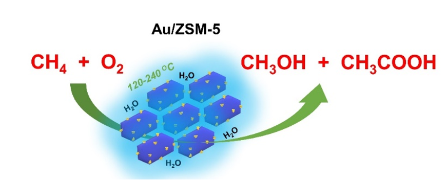 Au/ZSM-5催化甲烷選擇性氧化生成甲醇與乙酸示意圖