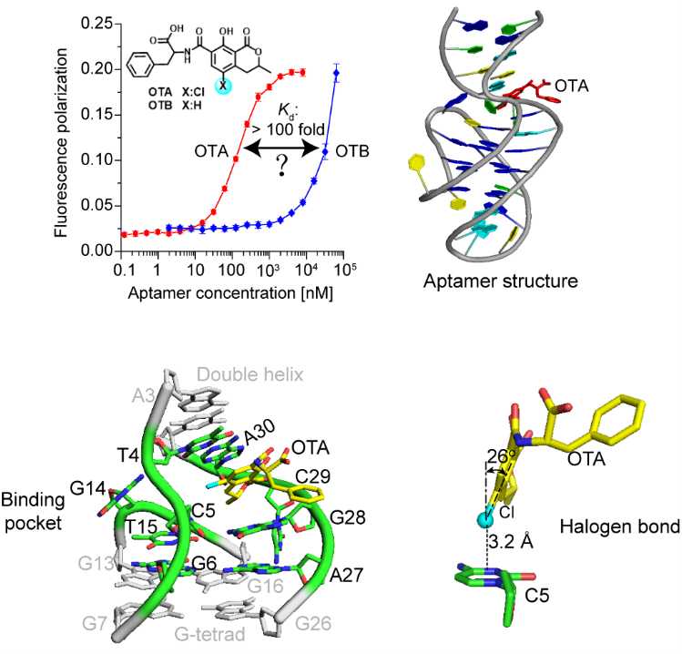 研究團隊通過液體核磁共振方法解析了核酸適體與OTA復合物在溶液中的高分辨結(jié)構(gòu),發(fā)現(xiàn)OTA誘導核酸適體折疊成了一個由Mg2+和Na+共同穩(wěn)定的雙螺旋-G-四鏈體結(jié)構(gòu)(見下圖)。與現(xiàn)已發(fā)現(xiàn)的小分子配體與G-四鏈體結(jié)合常通過配體與G-四平面直接堆積的模型不同,OTA并不直接與G-四鏈體相互作用,而是通過π-π堆積、鹵鍵和疏水作用,結(jié)合在雙螺旋與G-四鏈體結(jié)構(gòu)的連接處。并且,OTA的氯原子與核酸適體堿基芳環(huán)之間形成的強鹵鍵是核酸適體高親和、高特異性識別OTA的關鍵(OTB和OTA 有相同的結(jié)合位點,但缺少鹵鍵)。該工作揭示了核酸適體高親和、高特異性識別的結(jié)構(gòu)基礎,拓展了核酸適體識別靶標機制的理解,也為進一步的核酸適體優(yōu)化改造以及傳感檢測方法的開發(fā)應用奠定了重要基礎。