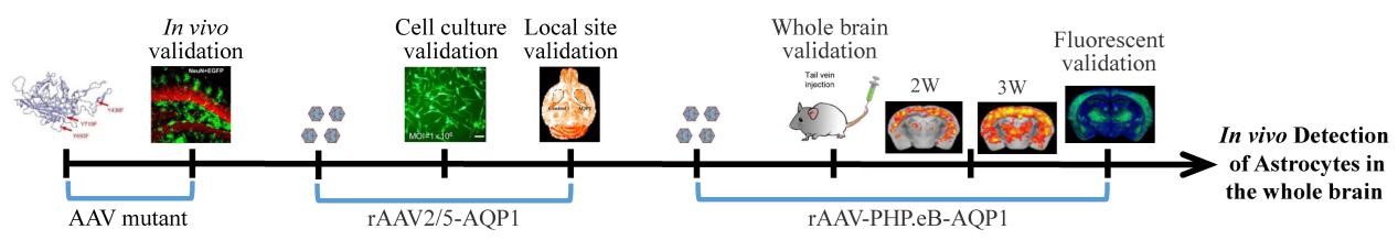 自2016年起,研究團(tuán)隊(duì)在精密測(cè)量院研究員徐富強(qiáng)和王杰的帶領(lǐng)下,聯(lián)合磁共振成像與病毒基因改造技術(shù)率先提出一種新型基因編碼生物磁共振成像技術(shù),逐步實(shí)現(xiàn)神經(jīng)元網(wǎng)絡(luò)(Neuroimage, 2019; Human Brain Mapping, 2021)和星形膠質(zhì)細(xì)胞(Molecular Psychiatry, 2022)在體水平的無創(chuàng)檢測(cè)。其中,rAAV是近年來發(fā)展極為迅速的一類工具病毒,是研究神經(jīng)科學(xué)相關(guān)問題和基因治療的重要載體。團(tuán)隊(duì)首先對(duì)rAAV工具病毒的衣殼蛋白進(jìn)行突變改造,并利用人類膠質(zhì)纖維蛋白的啟動(dòng)子GFAP構(gòu)建rAAV載體,提升了病毒工具在星形膠質(zhì)細(xì)胞的轉(zhuǎn)導(dǎo)效率(圖2)。