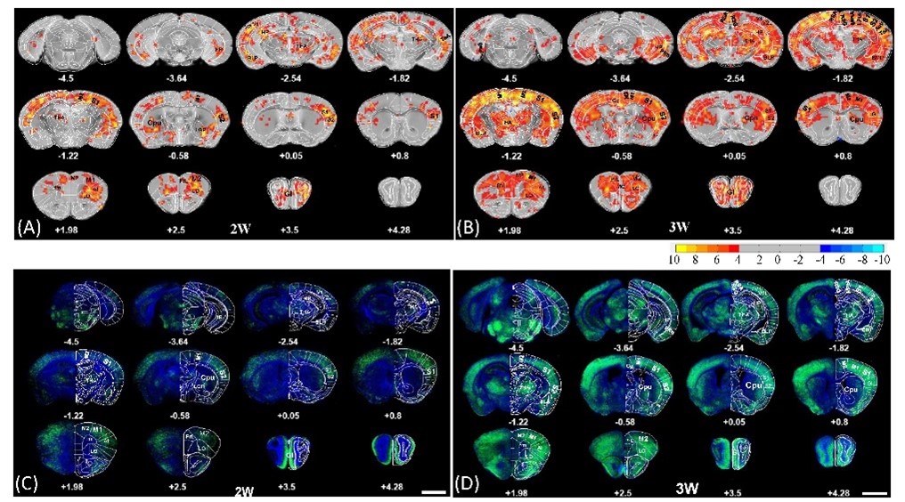 另外,水通道蛋白(Aquaporin, AQP)是一組高度保守的跨膜轉(zhuǎn)運(yùn)蛋白,對(duì)水具有高度選擇通透性。過表達(dá)AQP1蛋白可產(chǎn)生彌散加權(quán)成像(Diffusion-weighted imaging,DWI)信號(hào)的改變,因而水通道蛋白基因可作為磁共振成像報(bào)告基因。團(tuán)隊(duì)繼續(xù)對(duì)病毒載體rAAV2/5和rAAV2/PHP.eB進(jìn)行優(yōu)化改造,使其同時(shí)攜帶水通道蛋白報(bào)告基因和熒光元件,構(gòu)建新型工具病毒,逐步實(shí)現(xiàn)腦區(qū)和全腦水平的星形膠質(zhì)細(xì)胞的無創(chuàng)活體成像。在全腦成像研究中,團(tuán)隊(duì)構(gòu)建可高效通過血腦屏障的新型rAAV2/PHP.eB-AQP1-EGFP工具病毒,利用尾靜脈注射技術(shù)將該病毒注入小鼠體內(nèi),在病毒表達(dá)兩周和三周后分別進(jìn)行MRI活體成像,最終利用熒光成像對(duì)活體成像效果進(jìn)行評(píng)估(圖3)。結(jié)果顯示,該新型基因編碼生物磁共振成像技術(shù)不僅可實(shí)現(xiàn)星形膠質(zhì)細(xì)胞的活體全腦成像,而且其成像時(shí)間適用于常用的光遺傳學(xué)/藥理遺傳學(xué)相關(guān)研究。