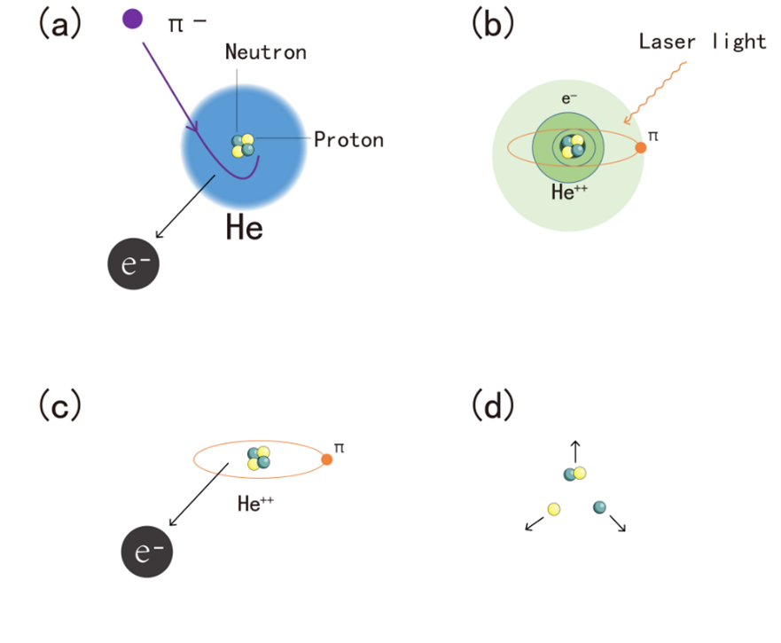 在鮑威爾發(fā)現(xiàn)宇宙射線中π介子的同年,“原子能之父”著名物理學家費米等人預言π-介子取代正常原子中的電子后可以形成各種奇異原子。這些奇異原子像“容器”一樣將π-介子存儲在分立原子軌道上,使我們可以利用激光技術加以研究。PSI 擁有領先世界的高亮度 1.3 MW 質(zhì)子環(huán)形回旋加速器,這使得 PiHe 合作組能夠獲得高通量的π-介子束流。如圖所示,π-介子束流轟擊氦靶,會將氦原子的一個基態(tài)電子敲掉并占據(jù)該電子的空間位置,并被較為穩(wěn)定的亞穩(wěn)態(tài)軌道“囚禁”起來。這些獨特的亞穩(wěn)態(tài)軌道與原子核距離較遠,因此可以保護π-介子在幾十納秒之內(nèi)不被原子核俘獲,這使得激光光譜探測成為可能。隨后,剩余的一個電子也被發(fā)射出去,π-介子落入低軌道并被原子核吸收,核裂變反應產(chǎn)生質(zhì)子、中子和氘核。