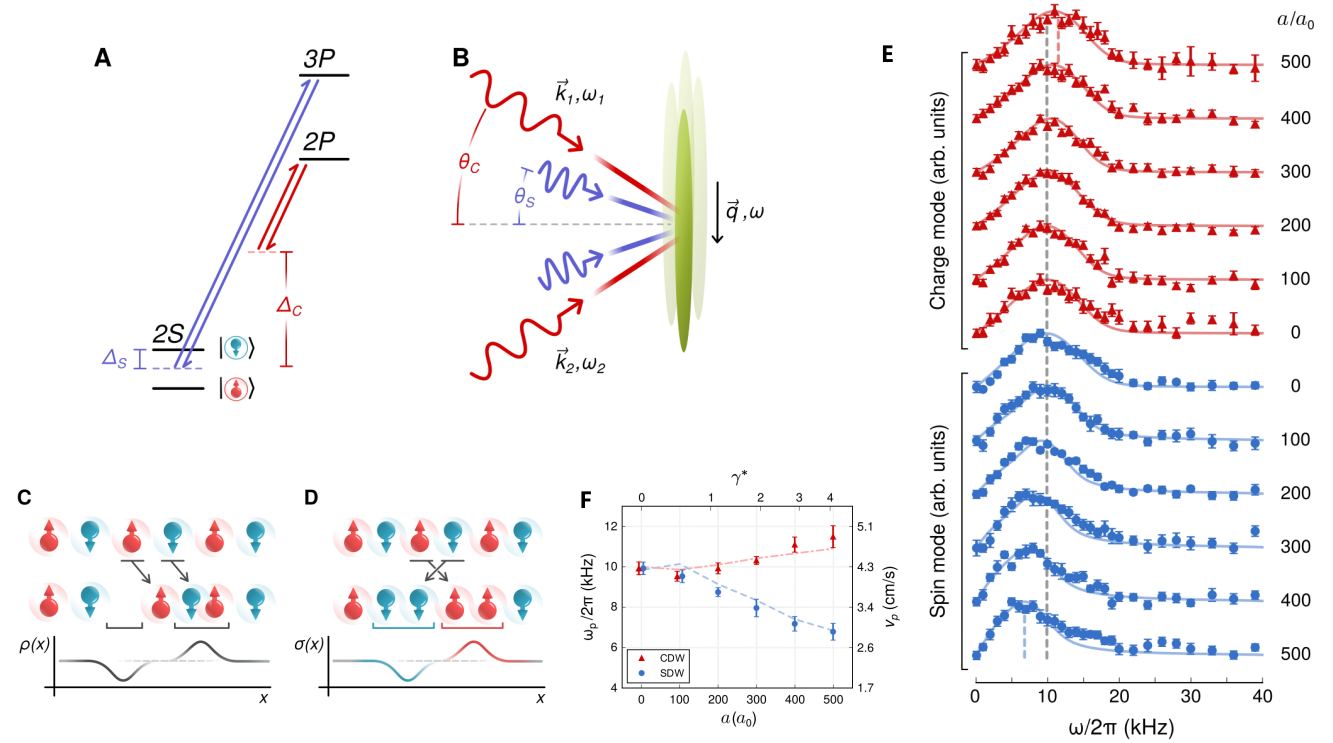 2020年至今,研究團(tuán)隊進(jìn)一步合作通過囚禁一維超冷原子實驗成功地驗證了這一重要的量子多體物理的普適規(guī)律。在囚禁的一維超冷6Li費米原子中,他們對電荷DSF的測量選擇了精細(xì)能級|1> and |2> (|F = 1, MF = ±1/2)作為自旋態(tài),2P3/2態(tài)為激發(fā)態(tài),對自旋DSF的測量選擇了精細(xì)能級|1> and |3> 作為自旋態(tài),3P3/2態(tài)為激發(fā)態(tài),參見圖二(A-D)。他們通過布拉格光分別激發(fā)電荷與自旋密度波,并調(diào)控不同相互作用強度測量出其相應(yīng)的電荷和自旋的布拉格譜,參見圖二(E)。在不同相互作用下布拉格譜的峰值給出了相應(yīng)的電荷和自旋的傳播聲速,參見圖二(F)。在理論方面,他們通過復(fù)雜的三維粒子數(shù)分布獲得了一維管狀系統(tǒng)中的密度分布,再進(jìn)一步利用一維相互作用費米氣體楊-高丁模型精確解和朝永-拉亭戈液體理論精確計算了囚禁冷原子電荷與自旋的DSF??紤]了電荷激發(fā)譜中的曲率修正和自旋激發(fā)譜中的反向散射引起的非線性效應(yīng)后,理論與實驗結(jié)果非常吻合。這在國際上首次通過超冷原子實驗驗證了自旋-電荷分離現(xiàn)象的朝永-拉亭戈液體理論,并給出非線性拉亭戈液體理論的有力證據(jù)。本項工作不但展現(xiàn)了量子多體物理中的典范,并且為將來基于原子分子和光物理的精密測量科技提供了新的思想。
