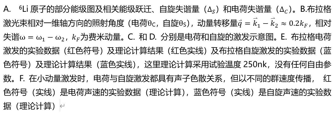中美研究團(tuán)隊自2018年開始合作,通過研究一維相互作用費米氣體楊-高丁模型(Yang-Gaudin model)的精確解,發(fā)現(xiàn)在長波極限下該模型中的電荷自由度的粒子-空穴集體激發(fā)和自旋自由度的分?jǐn)?shù)化準(zhǔn)粒子(自旋子)激發(fā)可完美地形成分離的自旋密度波和電荷密度波,這樣通過布拉格譜可以分別測得自旋和電荷的動力學(xué)結(jié)構(gòu)因子(dynamics structure factor(DSF)),該物理量深刻揭示了量子液體中多體關(guān)聯(lián)的本質(zhì)。因此,通過對相關(guān)集體激發(fā)譜的DSF的測量可以實現(xiàn)對自旋-電荷分離現(xiàn)象的確定性驗證,他們的這一理論預(yù)言在2020年率先發(fā)表在《物理評論快報》上(Physical Review Letters 125,190401 (2020))。