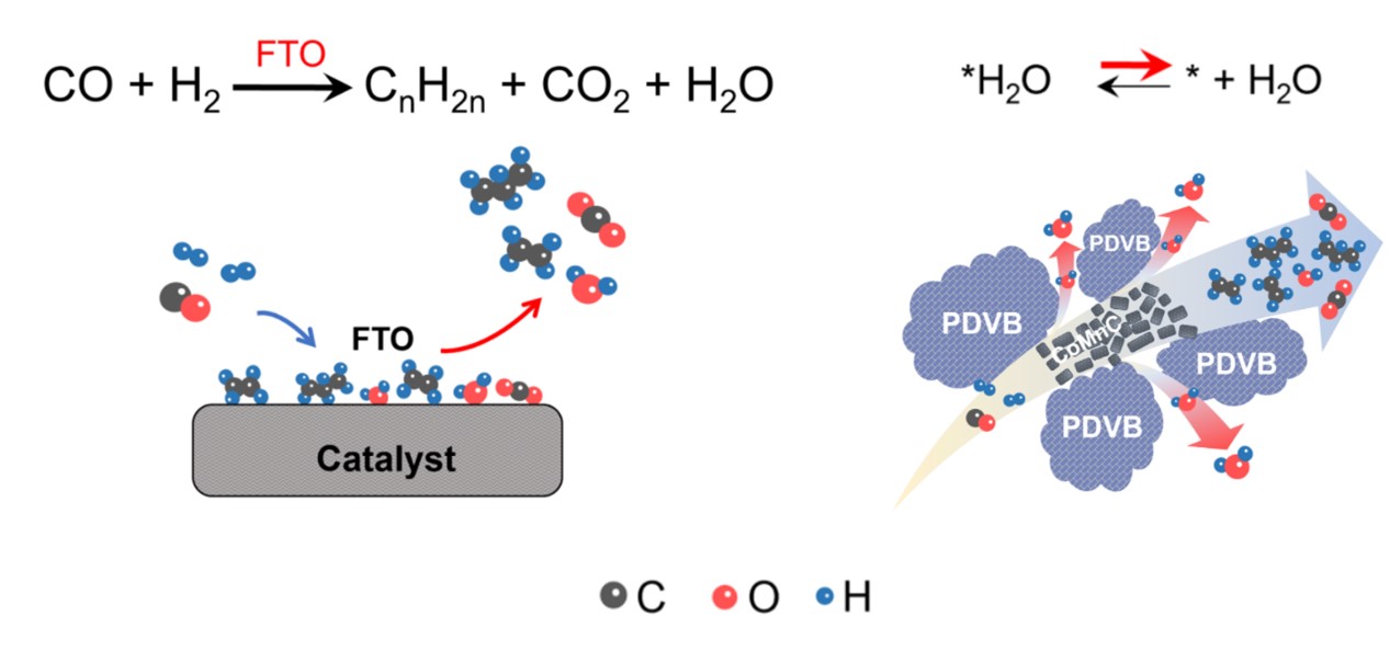 百年以來,科學(xué)家和工程師們對費托合成的工藝過程已進(jìn)行了多次創(chuàng)新、改進(jìn),但要實現(xiàn)一氧化碳加氫反應(yīng)的低成本、高效率進(jìn)行,仍存在許多挑戰(zhàn)。鈷基費托反應(yīng)過程中產(chǎn)生的水分子吸附在催化劑表面,會遮蔽掉催化劑表面的一部分活性中心,限制催化效能。因此,催化劑表面的水分子快速脫附顯得尤為重要。經(jīng)過反復(fù)推敲,研究團(tuán)隊找到了一個新穎的突破口,通過在催化體系中物理混合超疏水材料(聚二乙烯基苯)來調(diào)控催化劑表面水分子的動態(tài)平衡,實現(xiàn)對催化劑的性能調(diào)控。聚二乙烯基苯就像“轉(zhuǎn)運(yùn)助手”,在鈷錳碳化物(催化劑)顆粒之間開辟許多導(dǎo)水通道,為催化劑表面釋放出更多的活性位點,較普通催化劑大幅提升了水的擴(kuò)散速率。經(jīng)過這一優(yōu)化,在250 °C和0.1 MPa的溫和反應(yīng)條件下一氧化碳的轉(zhuǎn)化率提升到無疏水助劑體系的兩倍左右,達(dá)到63.5%。同時,烴類產(chǎn)物中低碳烯烴的選擇性達(dá)到71.4%。