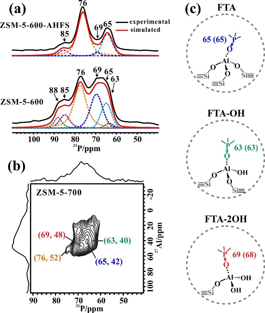 TMPO吸附在脫水分子篩上的一維 31P NMR譜和二維31P-27Al相關(guān)NMR譜以及TMPO吸附在三種不同骨架/骨架嵌連三配位鋁Lewis酸位上的結(jié)構(gòu)模型圖,括號里的數(shù)值為31P化學位移的理論計算值