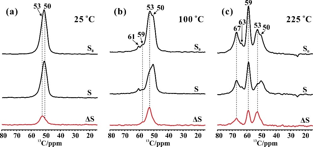 ZSM-5上13C-甲醇在不同溫度下反應(yīng)后分子篩上殘留物種的 13C-27Al S-RESPDOR NMR譜