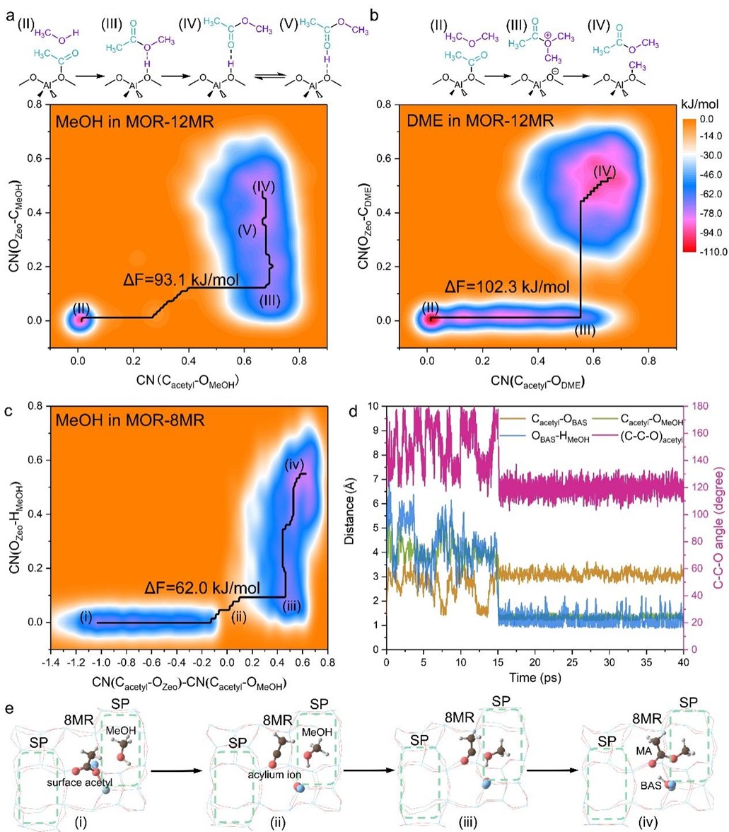 基于此,研究者設(shè)想表面乙酰基的另外兩種衍生物(乙烯酮和乙?;x子)是否能夠作為中間體生成乙酸甲酯? 然而,計算結(jié)果表明乙烯酮在8元環(huán)中會迅速質(zhì)子化變成乙?;x子,難以擴散出8元環(huán)孔道。所以只有乙?;x子能夠作為反應(yīng)中間體與甲醇(或者二甲醚)生成乙酸甲酯。為了驗證這一想法,研究者采用AIMD結(jié)合傘形采樣方法模擬了乙?;x子在有無甲醇或二甲醚共吸附下遷移出8元環(huán)孔道動態(tài)過程。如圖2中右邊的反應(yīng)路徑所示,無論是甲醇或二甲醚作為反應(yīng)物,乙酰基正離子從8元環(huán)遷移到12元環(huán)反應(yīng)生成乙酸甲酯比通過表面乙?;穆窂皆谀芰可细佑欣?