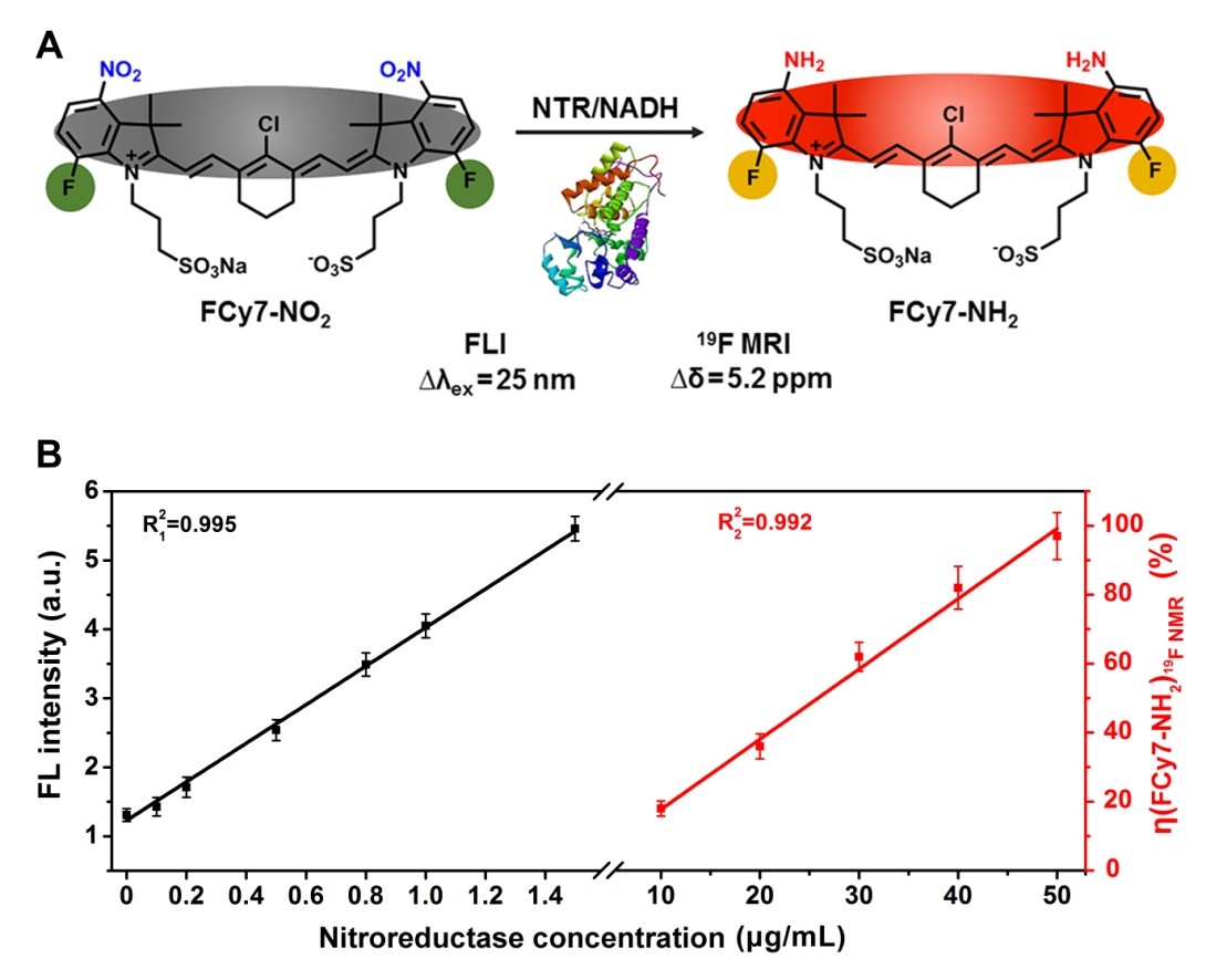 本工作提出的利用19F磁共振/熒光雙模態(tài)成像技術(shù)用于腫瘤中硝基還原酶的精準(zhǔn)成像及定量分析方法可為腫瘤標(biāo)記物的精確診斷提供一種重要工具。同時(shí),根據(jù)硝基還原酶的含量可用于區(qū)分正常和缺氧腫瘤組織,定量評估缺氧程度,有望為生物醫(yī)學(xué)領(lǐng)域提供新方法和新技術(shù)。