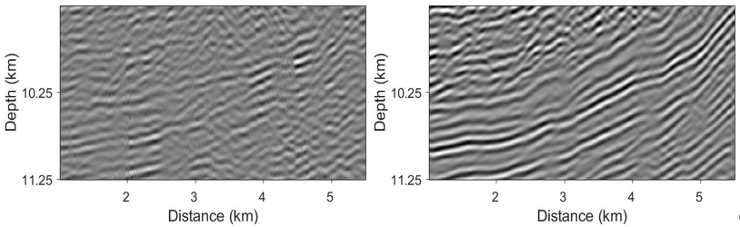 地震勘探經(jīng)歷了從二維走向三維,從疊后走向疊前,從時間域成像走向深度域成像的發(fā)展過程。然而,目前在工業(yè)界,仍缺乏在深度域直接進行反演的有效技術(shù)?,F(xiàn)有方法無法滿足精細儲層解釋的需要并計算量很大。針對上述問題,該團隊發(fā)展了一種基于點擴散函數(shù)的深度域最小二乘反演方法,避免了“時深轉(zhuǎn)換”的過程,大幅提高了反演效率。該方法可以有效地均衡照明,清晰刻畫斷層面,明顯提升空間分辨率。并且計算量只有傳統(tǒng)數(shù)據(jù)域最小二乘方法的1/10。