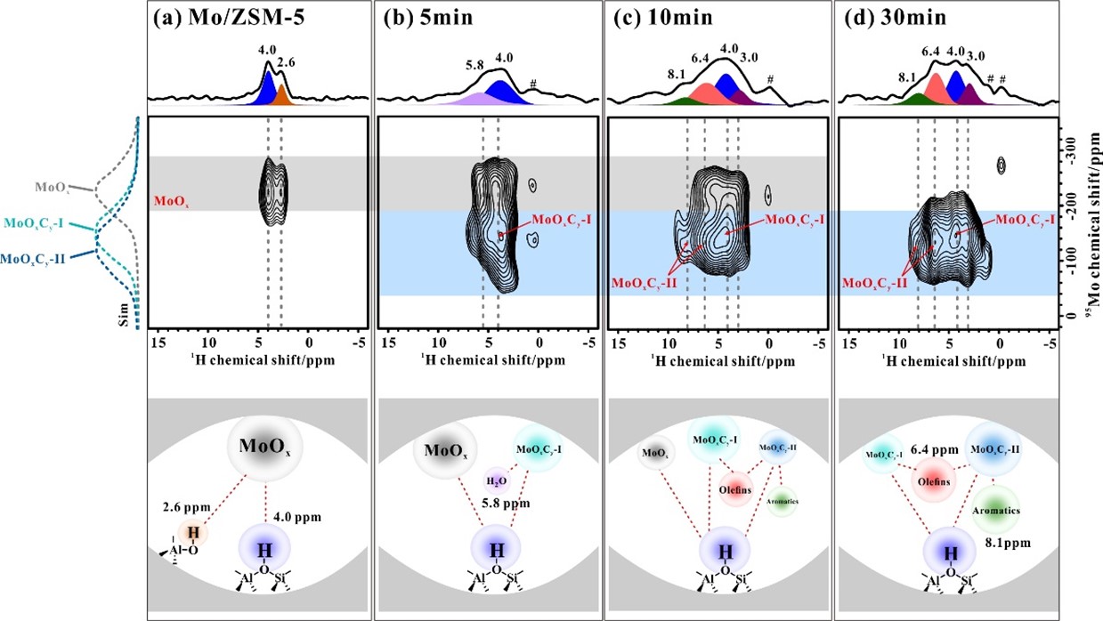 近日,精密測量院徐君與鄧風(fēng)研究團隊建立了靈敏度增強二維1H-95Mo異核相關(guān)固體NMR方法,實現(xiàn)了對甲烷無氧芳構(gòu)化反應(yīng)中Mo/ZSM-5分子篩孔道內(nèi)由“質(zhì)子-金屬”構(gòu)成的活性團簇進行選擇性地觀測,獲得了與分子篩孔道內(nèi)Bronsted(BAS)酸性位以及有機產(chǎn)物(烯烴和芳烴)空間臨近的活性MoOxCy物種信息,相關(guān)研究成果發(fā)表在《德國應(yīng)用化學(xué)》(Angew. Chem. Int. Ed.)上。
