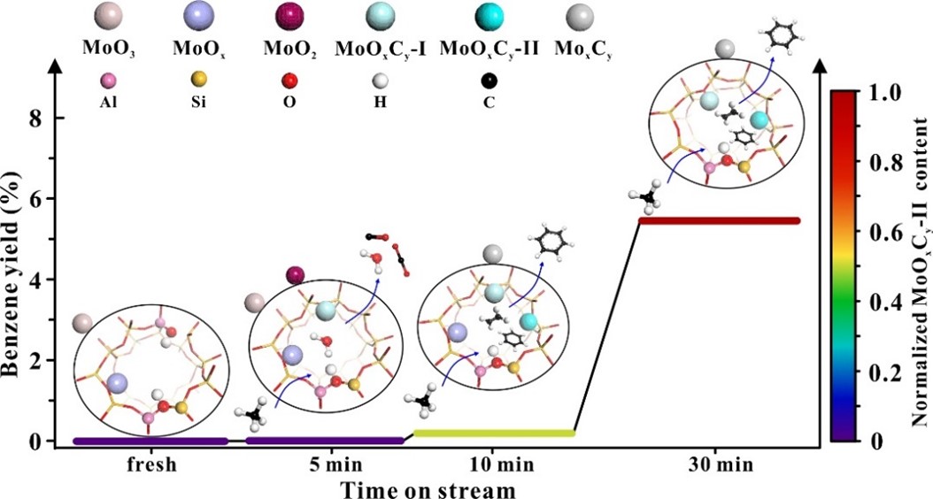 MDA反應(yīng)中Mo/ZSM-5上Mo物種隨反應(yīng)時間的演化過程。
