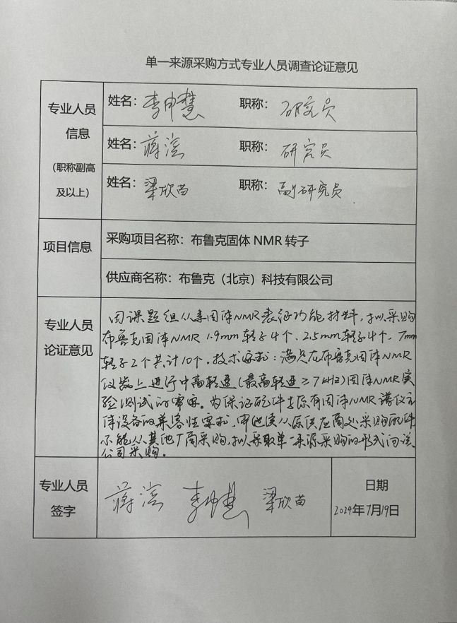 因課題組從事固體NMR表征功能材料,擬采購布魯克固體NMR 1.9 mm轉(zhuǎn)子4個(gè)、 2.5 mm轉(zhuǎn)子4個(gè)、7 mm轉(zhuǎn)子2個(gè)共計(jì)10個(gè)。技術(shù)要求:滿足在布魯克固體NMR儀器上進(jìn)行中高轉(zhuǎn)速(最高轉(zhuǎn)速:≥7KHz)固體NMR實(shí)驗(yàn)測(cè)試的需要。為保證配件與原有固體NMR譜儀主體設(shè)備的兼容性要求,需繼續(xù)從原供應(yīng)商處采購配件,不能從其他廠商采購,擬采取單一來源采購的形式向該公司采購。