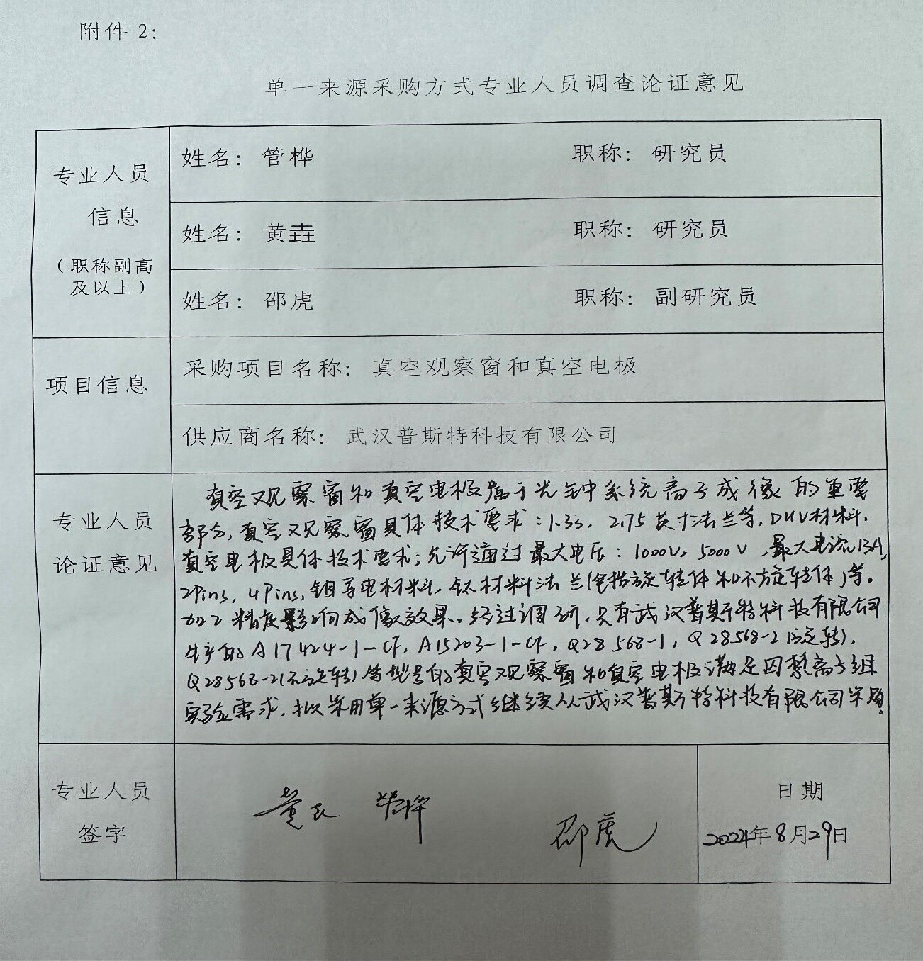 中國科學(xué)院精密測量科學(xué)與技術(shù)創(chuàng)新研究院關(guān)于向武漢普特斯科技有限公司采購真空觀察窗和真空電極單一來源公示