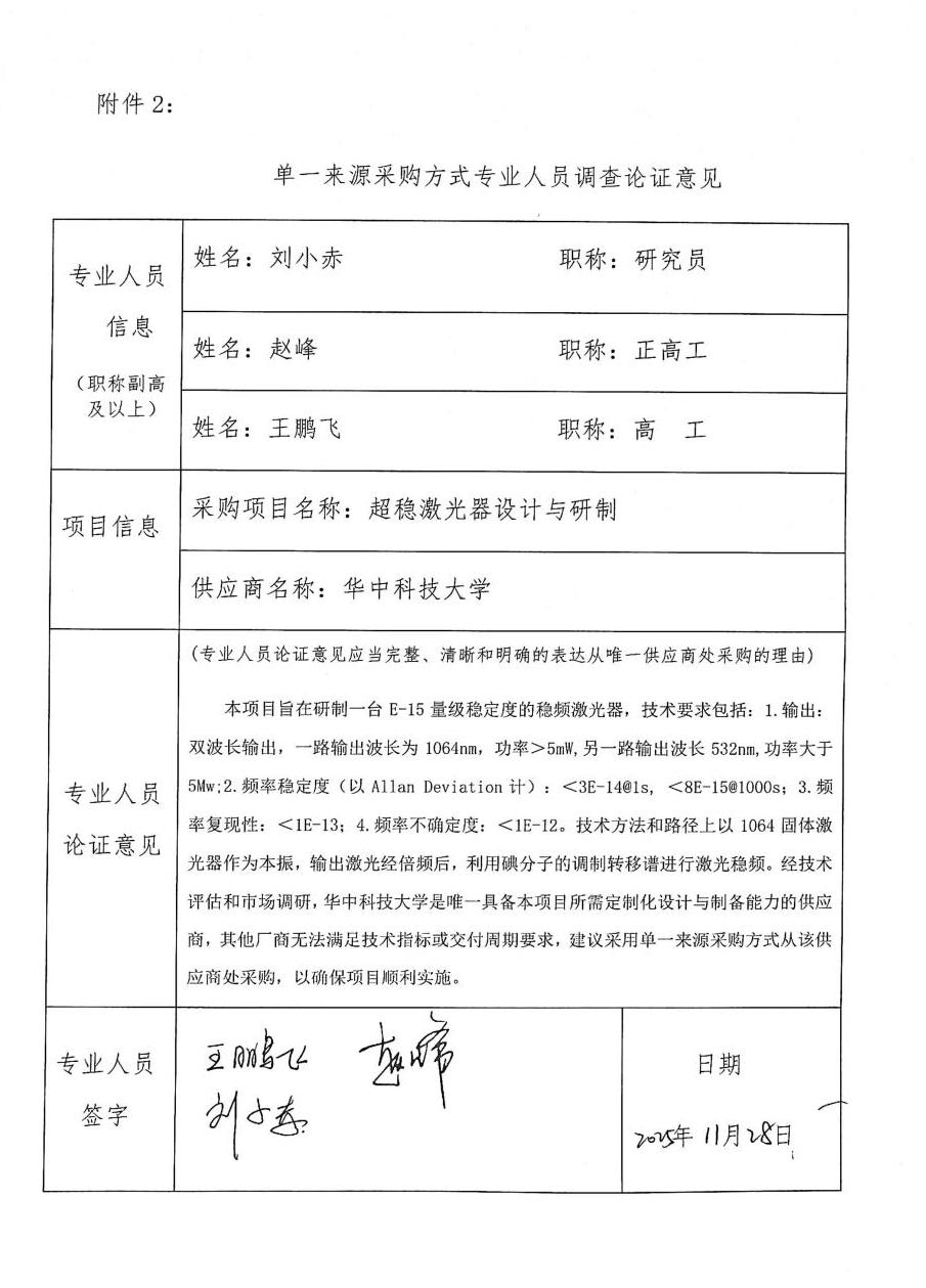 中國科學(xué)院精密測量科學(xué)與技術(shù)創(chuàng)新研究院關(guān)于向華中科技大學(xué)采購超穩(wěn)激光器設(shè)計(jì)與研制的單一來源公告