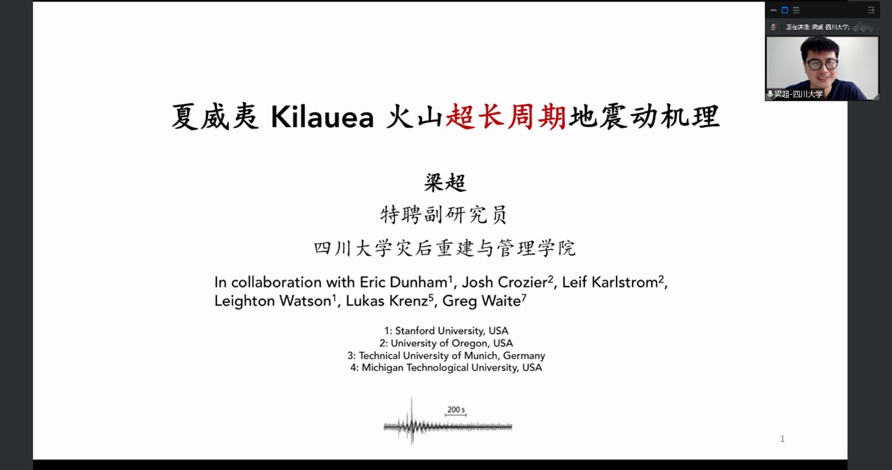 5月11日,應(yīng)精密測量院大地測量與地球動力學(xué)國家重點實驗室地球震動源運動與動力學(xué)過程課題組邀請,四川大學(xué)特聘副研究員梁超在線上平臺做了題為“夏威夷Kilauea火山超長周期地震動機(jī)理”的學(xué)術(shù)報告。