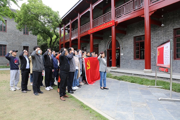 在“中共五大”會址前,全體黨員面對鮮紅的黨旗,在支部書記任曉華的領誓下,重溫入黨誓詞,共憶入黨初心。一句句鏗鏘有力的誓詞響徹在博物館上空,也映入了每個黨員的心中。