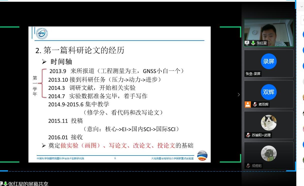來(lái)自大地測(cè)量學(xué)與測(cè)量工程專業(yè)的張紅星在國(guó)際地學(xué)頂級(jí)和權(quán)威刊物(JGR, JG, IEEE等)發(fā)表了多篇高水平學(xué)術(shù)論文,將研究成果成功應(yīng)用到我國(guó)相關(guān)重點(diǎn)科技任務(wù)的實(shí)施。張紅星通過(guò)時(shí)間軸的方式,分享了他從接到科研任務(wù)到進(jìn)行文獻(xiàn)調(diào)研、進(jìn)行實(shí)驗(yàn)準(zhǔn)備、再到完成實(shí)驗(yàn)、撰寫論文、投稿、接收的心路歷程。他提醒大家,在研究生學(xué)習(xí)期間,組內(nèi)老師都有自己的科研任務(wù),不可能對(duì)學(xué)生實(shí)驗(yàn)全程跟進(jìn)、事無(wú)巨細(xì)進(jìn)行指導(dǎo),一定要有足夠的自覺(jué)性和執(zhí)行力才能按時(shí)完成科研目標(biāo)。他推薦大家將目標(biāo)量化,學(xué)會(huì)制定計(jì)劃表,讓抽象的目標(biāo)變成具體可感的壓力。他說(shuō),在科研過(guò)程中,有壓力才能有動(dòng)力、有動(dòng)力才會(huì)有方向,一定要以任務(wù)為導(dǎo)向參與其中,認(rèn)真研究、認(rèn)真實(shí)踐,才能讓工作穩(wěn)步推進(jìn),最終取得屬于自己的科研成果。