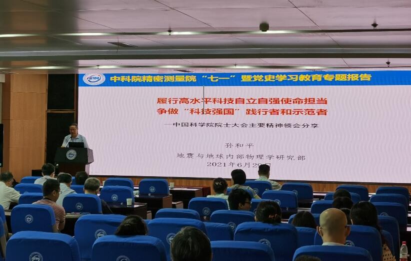 中國科學(xué)院院士孫和平作《履行高水平科技自立自強使命擔(dān)當(dāng)、爭做“科技強國”踐行者和示范者——中國科學(xué)院院士大會主要精神領(lǐng)會分享》黨課報告。從分享1980年和2021年二次中國科協(xié)全國代表大會的出席證開始,孫和平院士講述了2021年兩院院士大會、中國科學(xué)技術(shù)協(xié)會第十次全國代表大會的基本情況和主要內(nèi)容,從7個方面闡述了習(xí)近平總書記重要講話和大會精神。他表達了對黨領(lǐng)導(dǎo)中國人民贏得的好日子的珍惜之情,分享了對弘揚科學(xué)精神的深刻理解,對科研評價體系建設(shè)、青年人才隊伍建設(shè)的深入思考,勉勵精密測量院全院科技工作者弘揚科學(xué)家精神、對標(biāo)科技創(chuàng)新“四個面向”,積極投身科技創(chuàng)新體系建設(shè),不斷增強履行高水平科技自立自強的使命感,心系“國家事”,肩扛“國家責(zé)”,爭做“科技強國”的踐行者和示范者。